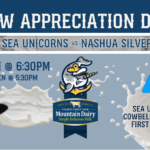 The Norwich Sea Unicorns are hosting Cow Appreciation Night on Tuesday, July 9th when they host the Nashua Silver Knights at 6:30pm. The first 100 fans through the gates will receive a cow bell courtesy of Mountain Dairy. The Kids Zone will host baby cows for fans to see and learn more about as well. Join us for Cow Appreciation Night on Tuesday evening. Gates open at 5:30pm!